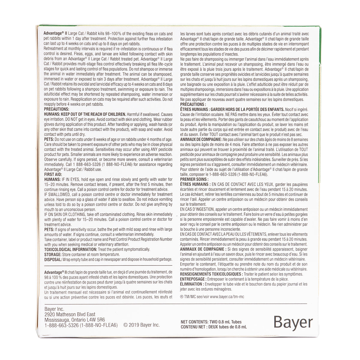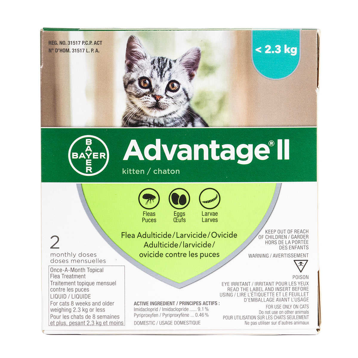 nce-A-Month Topical Flea Treatment. advantage® II Large cat kills 98-100% of the existing fleas on cats within 1 day after treatment. Protection against further flea infestation can last up to 4 weeks. Retreatment at monthly intervals is required if re-infestation is continuous or if flea control is desired. If re-treatment becomes necessary earlier than 4 weeks, do not retreat more than once weekly. Fleas, eggs, and larvae are killed following contact with skin debris from an advantage® II kitten treated pet. Advantage® II kitten provides multi-stage flea control effectively breaking all flea life-cycle stages for quick and lasting control of flea populations. Do not shampoo or immerse the animal in water immediately after treatment. The animal can be shampooed, immersed in water or exposed to rain 3 days after treatment. Advantage® II kitten retains its ovicidal and larvicidal efficacy up to 4 weeks following a shampoo treatment, swimming or exposure to rain. The adulticidal effect may be shortened by repeated shampooing, water immersion or exposure to rain. Re-application may be required after such activities.