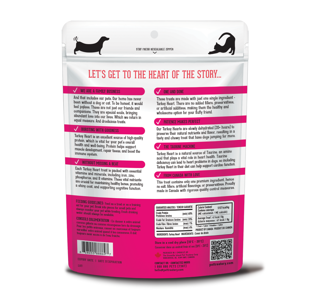 Have A Heart - Premium Dehydrated Turkey Heart Treat For Dogs & Cats 80g. These treats are made with just one single ingredient - turkey heart. There are no added fillers, preservatives, or artificial additives, making them a healthy and wholesome option for your furry friend.