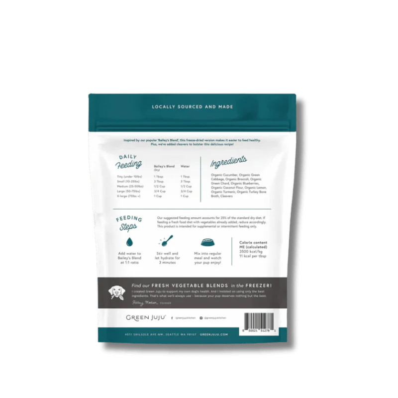 A detoxifying raw nutrient boost for dogs and cats, Freeze-Dried Bailey’s Blend with Cleavers is a fresh twist on our signature blend.