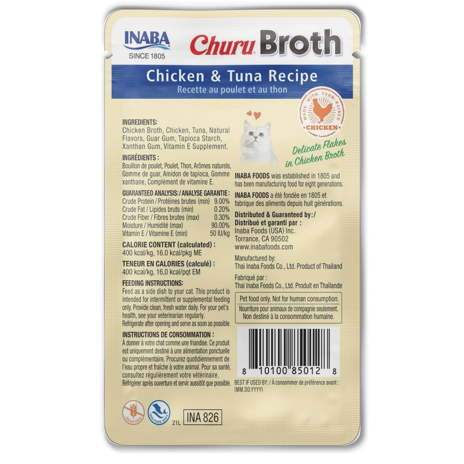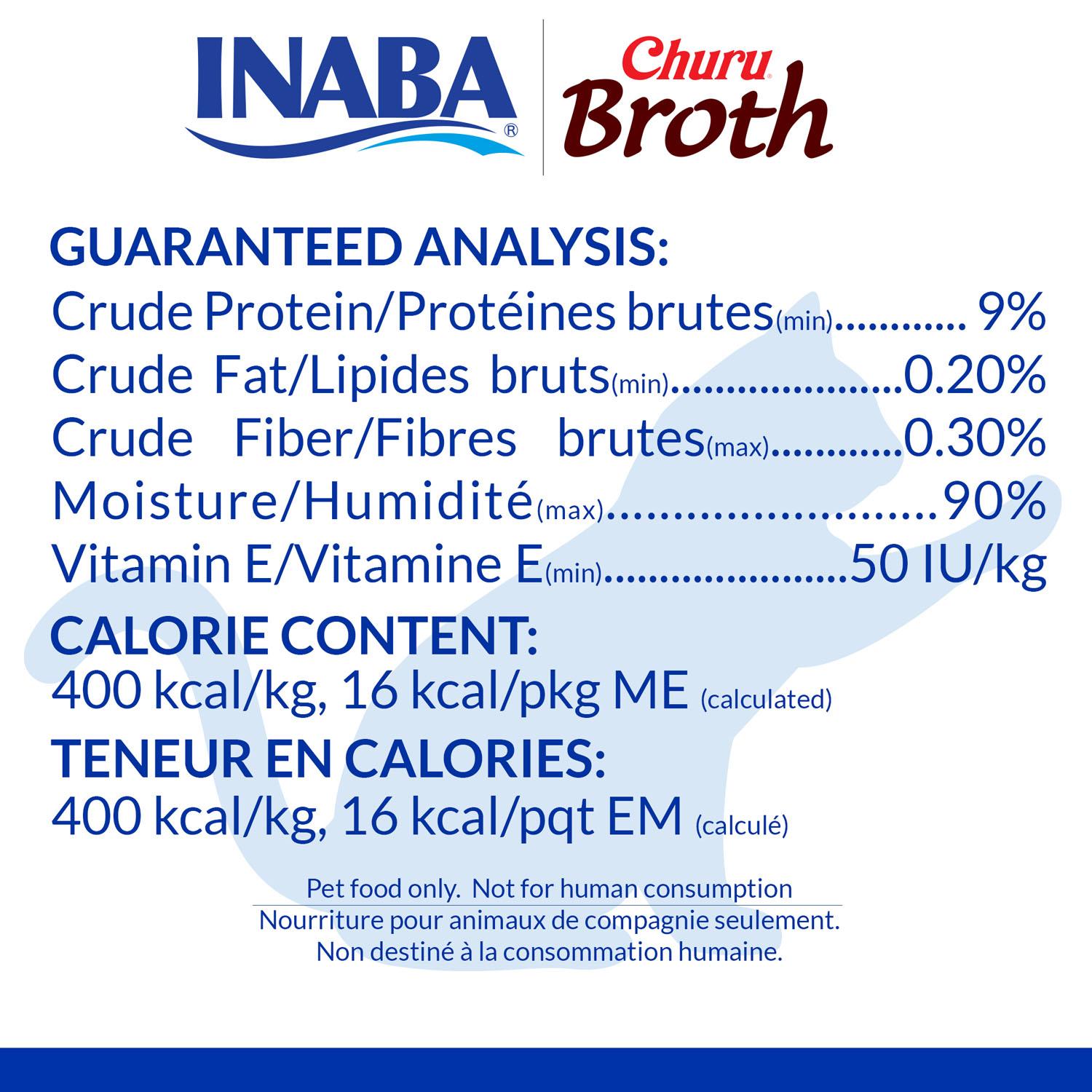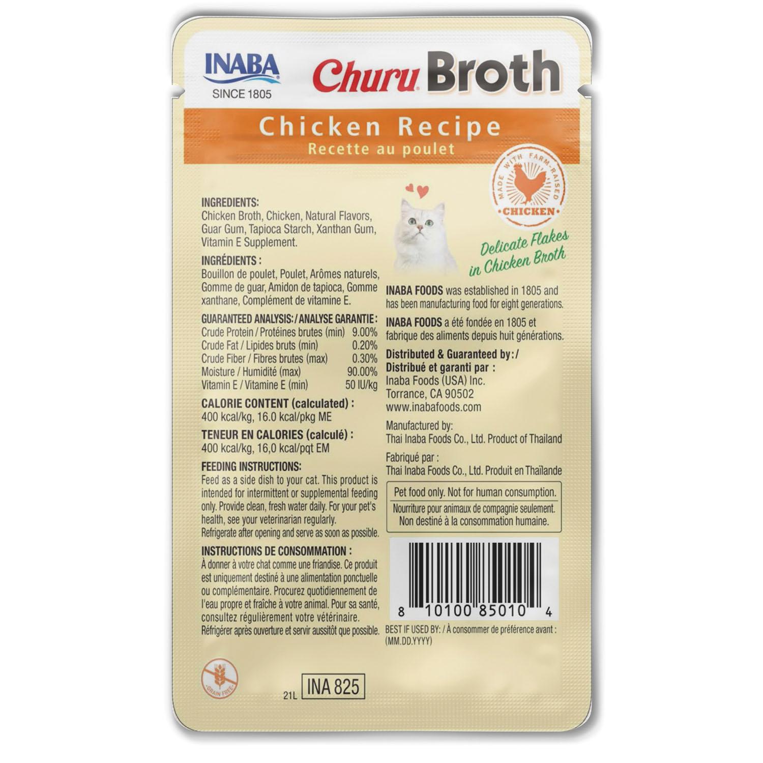 Inaba Churu Broth Chicken Recipe Cat Food Topper starts with silky chicken broth made from 100% natural farm-raised chickens and contain no grains, preservatives or artificial colours. Each pouch contains a healthy serving of chicken broth. With Vitamin E (an essential nutrient that helps support your cat's immune system), 90% moisture to help aid with feline hydration and 16 kcal per pouch, these are a healthy low calorie treat you can feel good about feeding your cat. Perfect for all ages- kitten to senior, simply tear open the pouch and pour out the delicious mix of broth and flaky meat. Use as a side dish, complement to a meal, wet/dry cat food topper or as a special treat, your kitties will thank you from the bottom of their paws.
