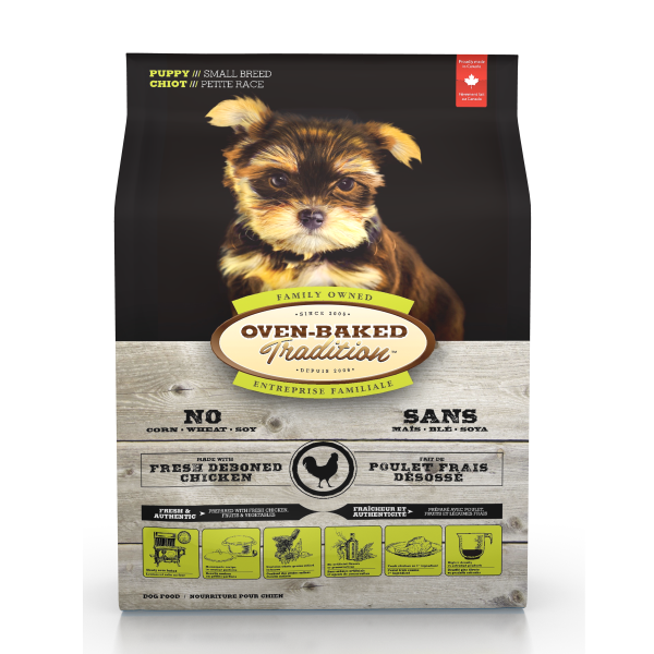 Oven-Baked Tradition's Small Breed Puppy dog food is slowly oven-baked at a low temperature to bring out the ingredients' flavors while preserving the integrity of essential nutrients and proteins. It's made in small batches to ensure freshness and quality. Fresh chicken is the first ingredient along with fruits & vegetables. It contains whole grains milled in-house and is made without wheat, corn or soy and has no artificial flavors or preservatives.