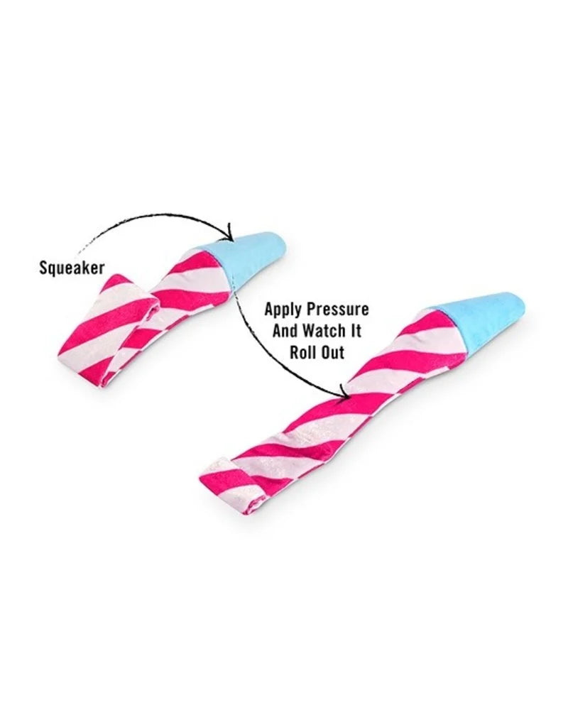 Make any time party time with a fun and colorful Party Time Toy from P.L.A.Y.! Let your dog unleash their inner paw-ty animal with this fun Raise the Woof Party Horn Features a plush and squeaky party horn toy that rolls out when your dog chomps down for extra tail-wagging fun! Each P.L.A.Y. toy features durable double-layers and double-stitched edges for a long-lasting toy! New ChewShieldTM technology adds a protective lining to provide extra durability. Eco-friendly PlanetFill® filler is made from 100% post-consumer certified-safe recycled plastic bottles for a dog toy that is both safe for your pet and safe for the planet. Your dog will have a blast with these party toys! Collect them all! Machine Washable & Dryer-Friendly. Picked by the Pet Beastro for your little party animal!