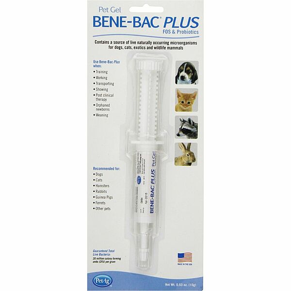 Bene-Bac? Plus Pet Gel is a palatable gel in an easy-to-use, 15-gram syringe or 1-gram tube containing concentrated FOS and live, naturally occurring microorganisms. Bene-Bac? Plus Pet Gel is recommended any time an animal experiences changing nutritional or environmental conditions.