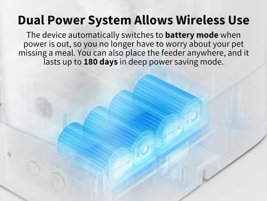 - Has a backup power supply in case of power outages, and the feeder can dispense 15 meals daily for up to 180 days in energy-saving mode.