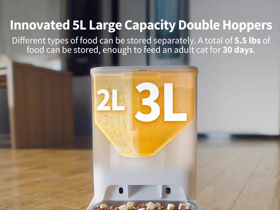 - 5 L large capacity, the two hoppers combine to form a 5L volume hopper. Enough to feed an adult cat for up to 30 days.