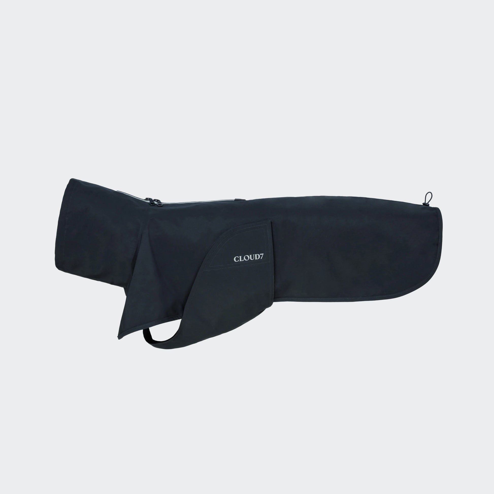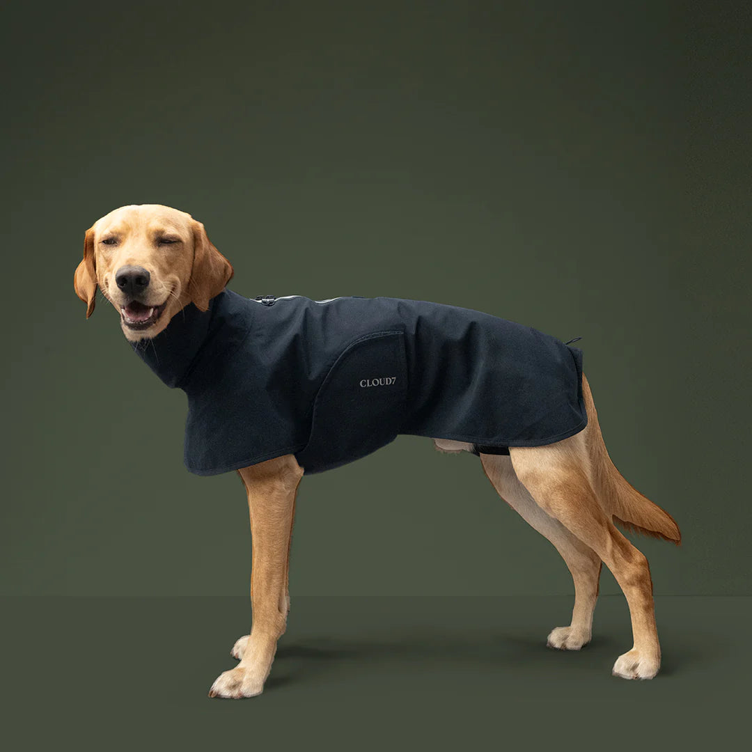 Weatherproof yet breathable dog raincoat for the rainy season. Featuring an extended design to provide optimal coverage of the body, long two-way zipper for easy access to harnesses and collars as well as an additional tag to attach a safety light such as Orbiloc® in low light days. The detailing of a storm collar, taped seams and ventilation eyelets ensure that the dog stays dry despite heavy rainfall. Built-in elastic bands for the hind legs allow the raincoat to stay in place during runs and plays, whereas the elastic cord near the rear allows the length to be adjusted for a tailored-like fit.