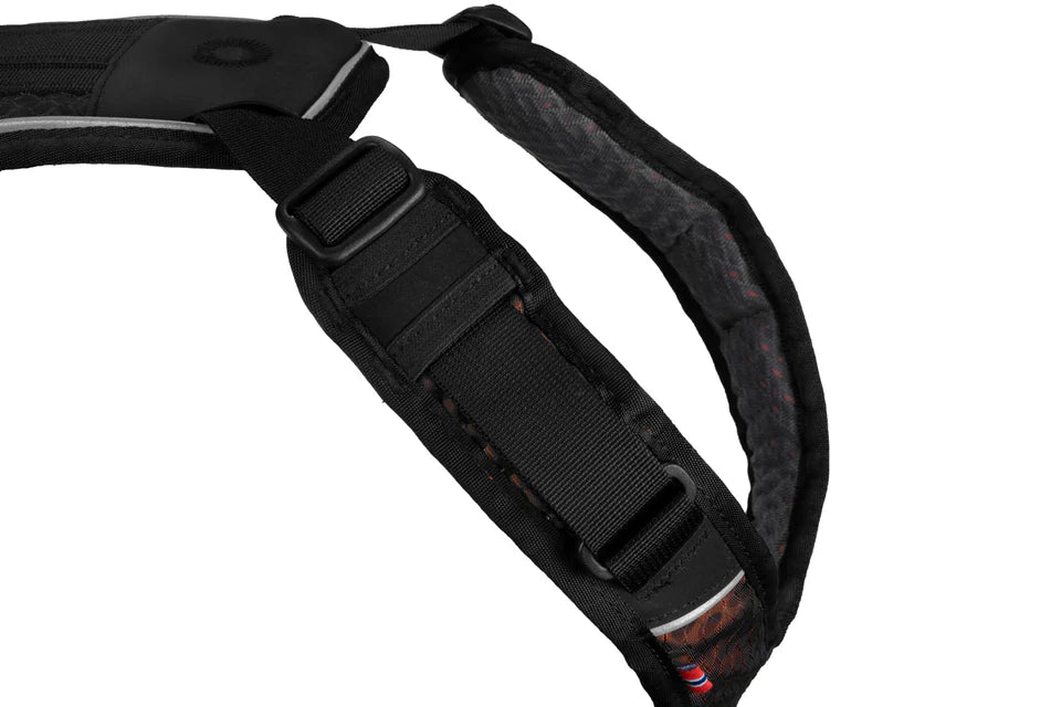 Rock harness is a padded harness which covers multiple aspects of an active lifestyle. The three leash attachment points make it very versatile. In addition to the aluminum D-ring attachment point on the back, there is a hoop for tracking line under the chest, as well as a third point at the front of the harness for mild anti-pull control.