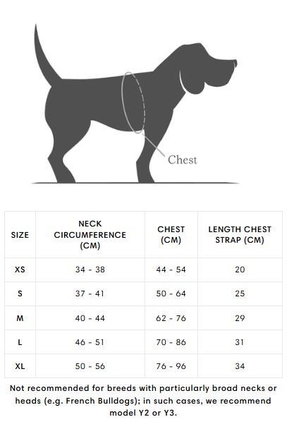Suitable for dogs of all sizes. Not recommended for breeds with particularly broad necks or heads (e.g. French Bulldogs); in such cases, we recommend model Y2 or Y3.
