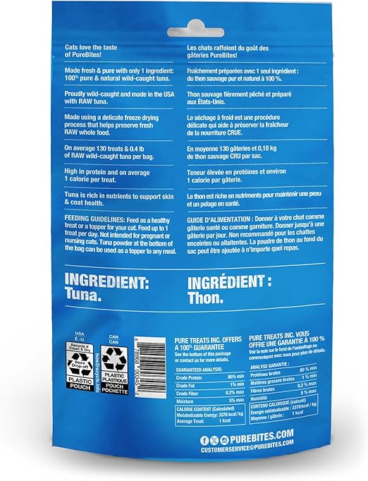- PureBites is a proudly Canadian company treating and feeding pets from coast to coast since 2005. Our tuna treats are made fresh & pure, using a delicate freeze drying process that helps preserve fresh RAW whole food; with 0.4lb of RAW tuna and 130 treats per 1.8oz bag, our bags are packed with more protein and nutrients