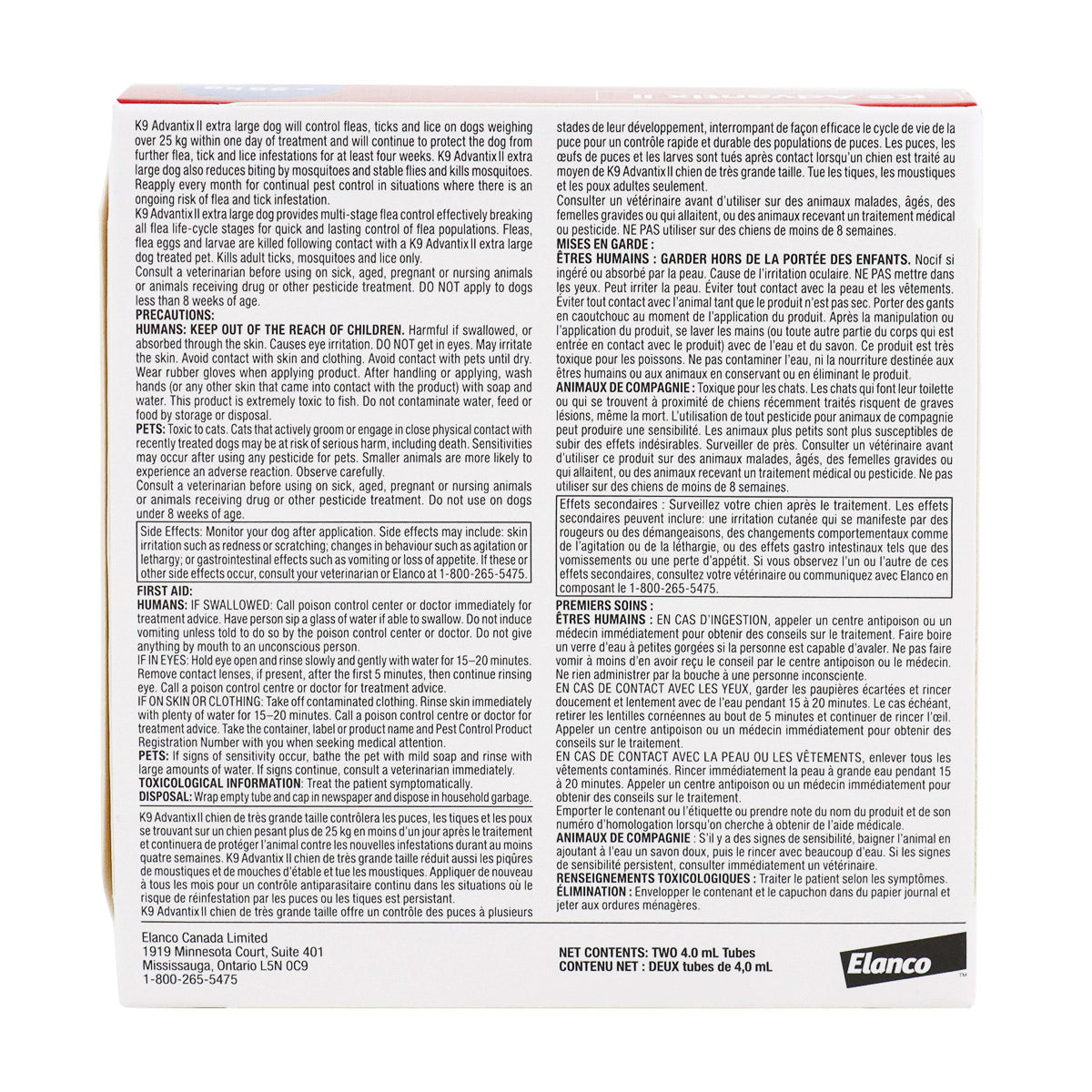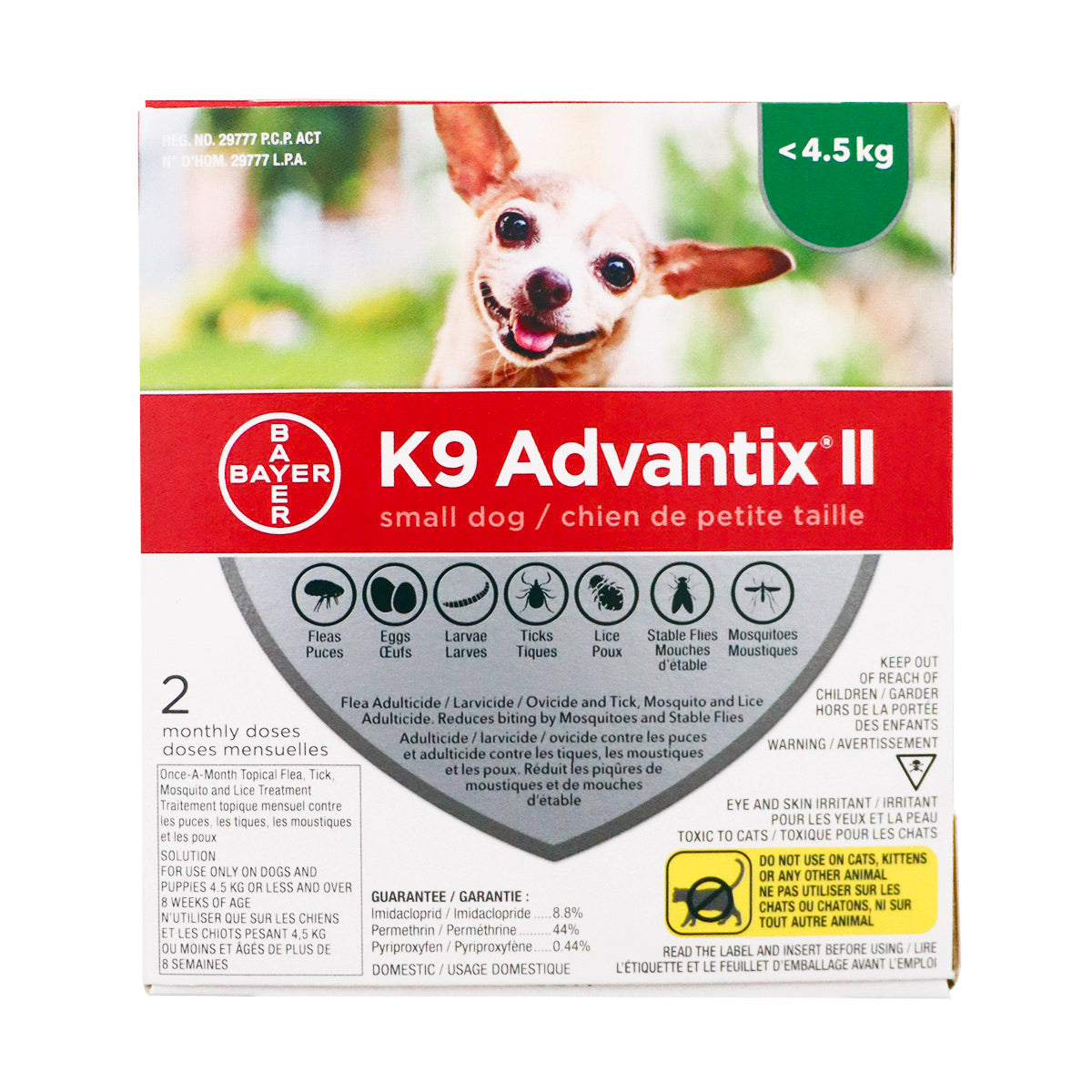 K9 Advantix® II controls fleas, ticks and lice on dogs within one day of treatment and will continue to protect the dog from further flea, tick and lice infestations for at least four weeks. K9 Advantix® II also reduces biting by mosquitoes and stable flies; and kills mosquitoes. Active ingredients: imidacloprid, permethrin, pyriproxyfen. DO NOT USE ON CATS,KITTENS OR ANY OTHER ANIMALS AND IF CATS RESIDE IN THE HOUSEHOLD, SEPARATE FROM DOGS THAT HAVE HAD A RECENT APPLICATION FOR A MINIMUM OF 24 HOURS. READ ALL INSTRUCTIONS BEFORE USE.