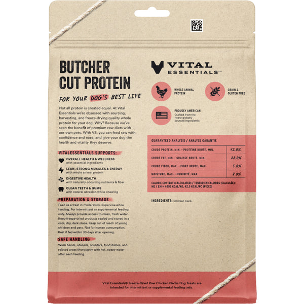 An excellent source of butcher cut protein, chicken necks are loaded with calcium, phosphorus, and other naturally occurring vitamins and minerals to support your pet's everyday vitality. Treat your dog to butcher cut raw protein between meals for a snack that builds strong muscles for more play, naturally supports digestive and oral health, and provides essential nutrients to support your dogs vitality.