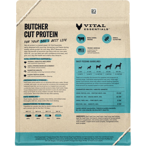 When it comes to feeding your dog a raw diet, superior protein provides superior benefits. Packed with butcher cut protein, Vital Essentials limited ingredient freeze-dried patties are the perfect solution to serving your dog a raw diet containing the naturally occurring vitamins and minerals that build strong muscles for more play, naturally support digestive and oral health, and provide essential nutrients to look and feel their best.